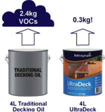 Traditional solvent based timber finishes contain high levels of Volatile Organic Compounds (VOCs) which are greenhouse gas carbon emissions that evaporate into the atmosphere as the coating dries. These compounds are usually petro-chemical solvents which are characterised by strong chemical fumes that contribute to air pollution. For every four litre can of traditional decking oil, usually at least two litres of VOCs go straight into the atmosphere.